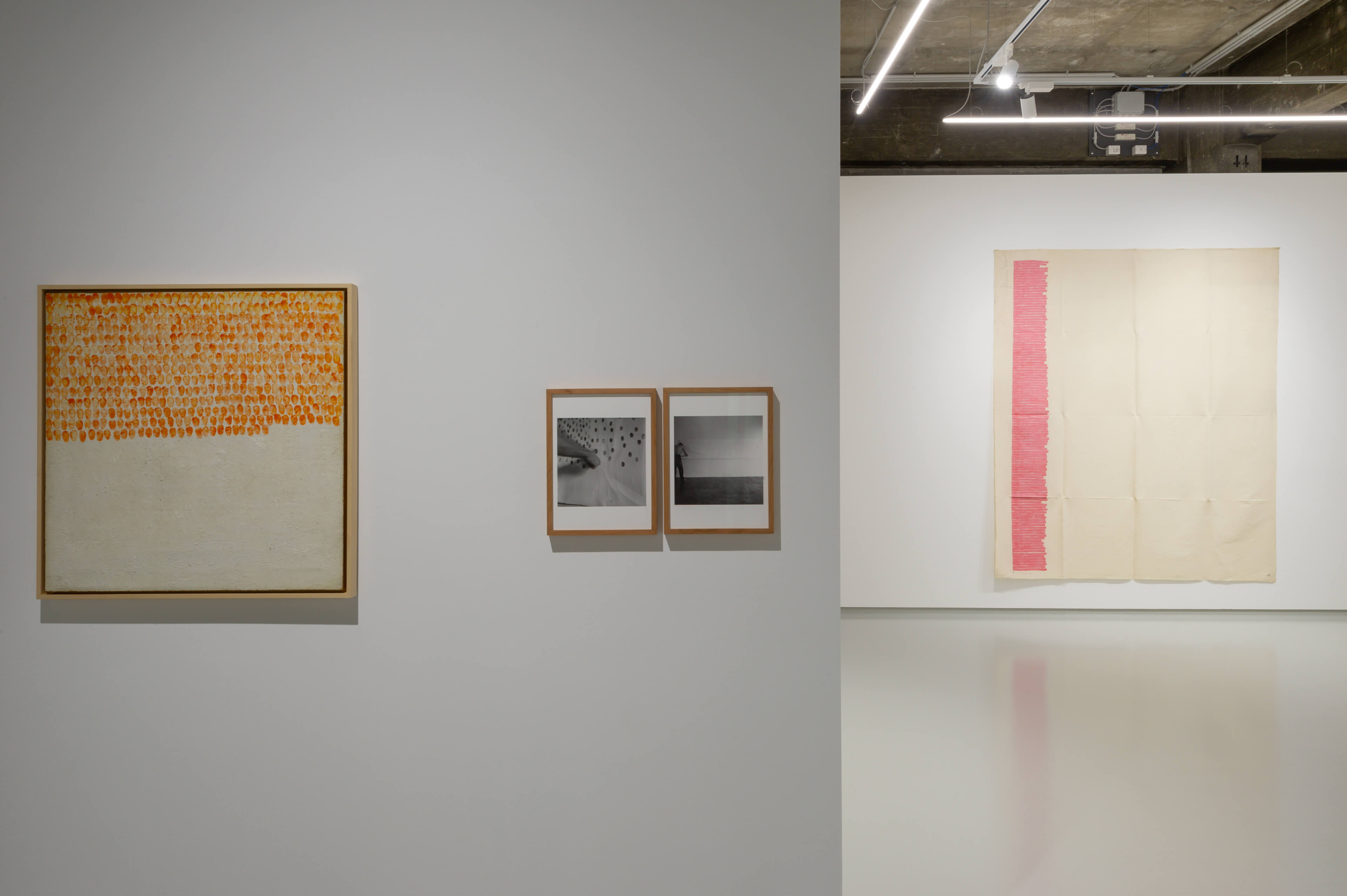 Marks, lines, segments. Horizontal, vertical, diagonal. Sponge marks, thumbprints, brushstrokes. A last use of oil paint, then acrylics and pastels. Paints applied by brush, or with a spatula or by thumb, on unprimed canvases, unstretched and set free. Primary signs.