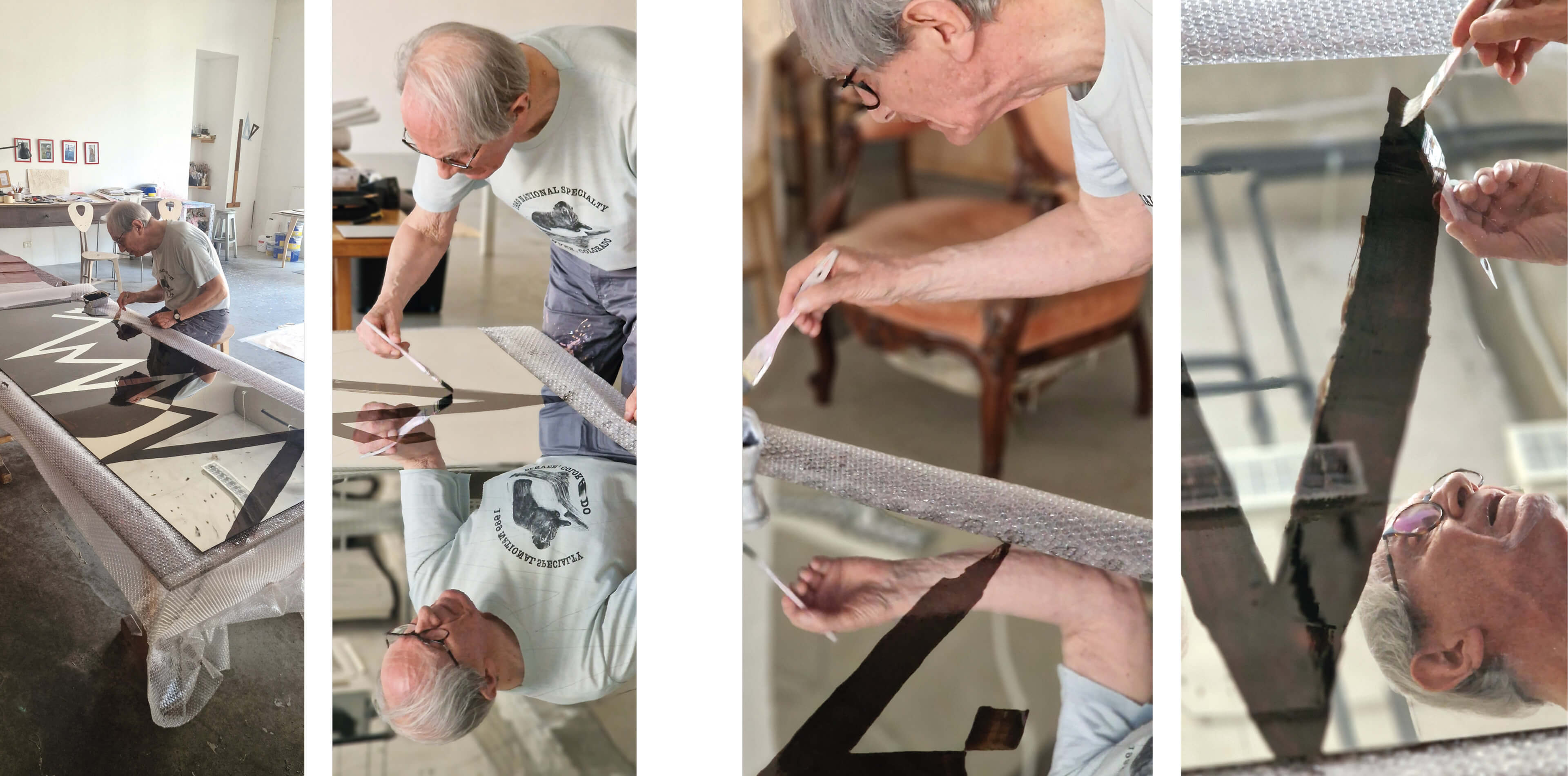 Alla pratica sensibile condivisa con il maestro Griffa, fatta di aggiustamenti di dettaglio e decisioni puntuali, si è affiancata la realizzazione e gestione di matrici di dimensioni non consuete — le più grandi 75 × 200 cm — che rende evidente la straordinaria perizia tecnica della Stamperia Albicocco, chiamata a misurarsi con una scala operativa complessa e raramente affrontata nella calcografia.